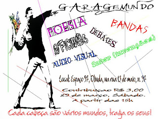 Enfim (mas no começo de tudo) vai rolar mais um Garagemundo na mutação de um evento multi-cultural, afinal quem pensa que a idéia do Garagemundo se resume a eventos espóradicos está quadradamente enganado, basta sacar ou participar das diversas intervenções que rolaram, e indepedente disso ainda vai além...Garagemundo não é isso, mais aquilo...Ou não!! São idéias que pulsam nos corações, ou luzes que piscam nas mentes, que ardem e que sentem uma vontade de afetar aquilo que está ao nosso redor, de criar e destruir, de criativizar com uma liberdade centrífuga que assusta qualquer dogma. E é numa garagem ou numa pequena faísca de atitude, que você começa a afetar o mundo, você mesmo, e os outros.